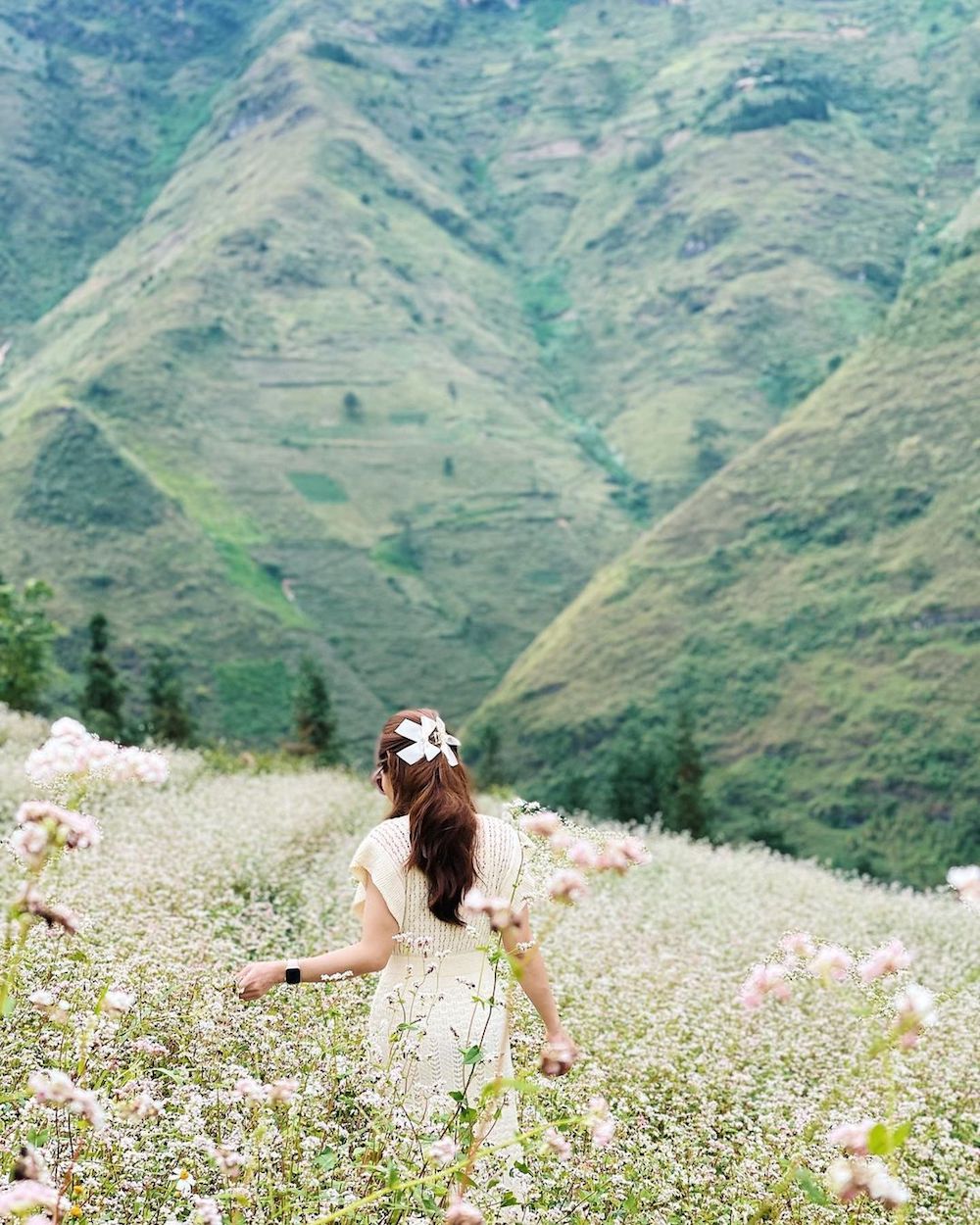 Một tấm ảnh nên thơ ở núi rừng Mộc Châu cùng những cánh hoa tam giác mạch (Nguồn: Instagram @hong.van89).