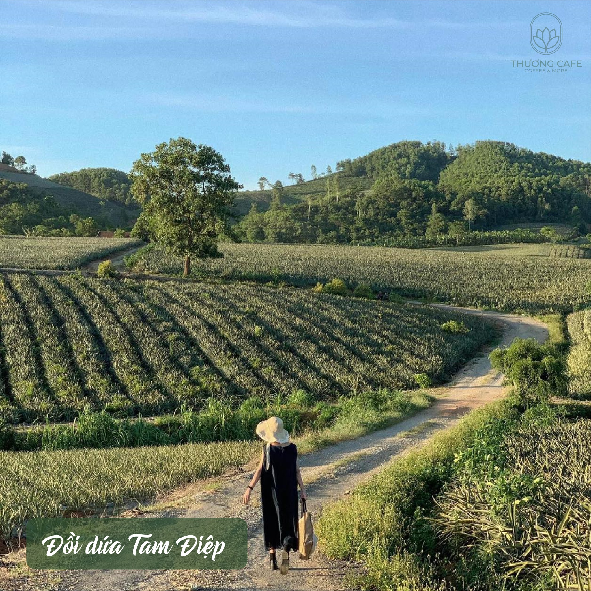 Đến với Đồi dứa Tam Điệp, bạn sẽ được tận mắt chiêm ngưỡng cánh đồng dứa xanh ngát mà điểm tô trên đó những đốm vàng rực rỡ của những quả dứa đang sắp vào mùa thu hoạch. Ngoài ra khi đến đây bạn còn được trực tiếp thưởng thức những trái dưa thơm ngon vừa mới được hái ngay tại nông trại. Những quả dứa ngọt lịm, thanh mát và mọng nước sau một buổi chụp hình chính là một trải nghiệm tuyệt vời khi có dịp ghé thăm địa điểm xinh đẹp này.