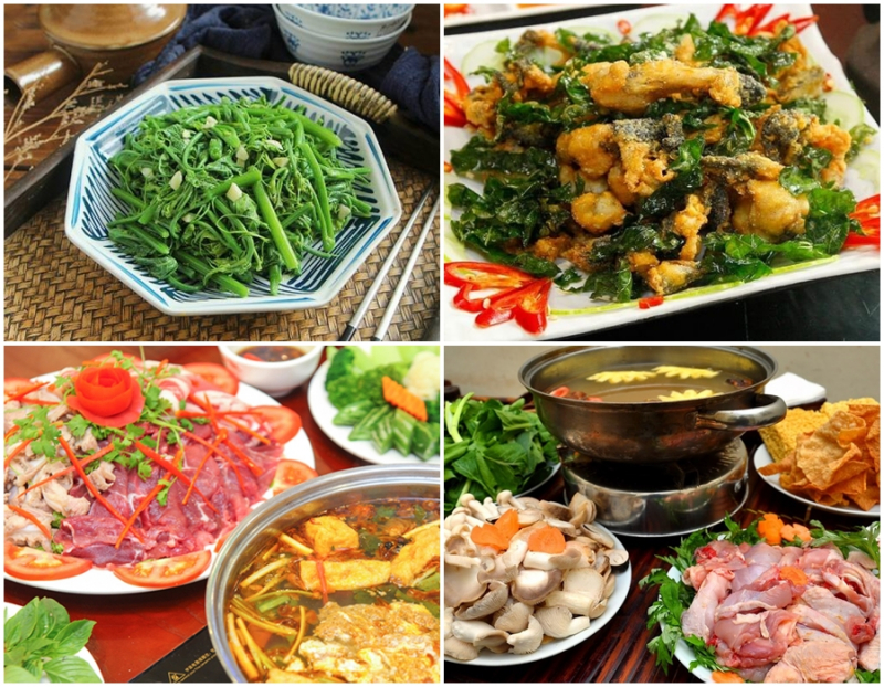 Món ăn đặc trưng: Gà quay bánh bao, gà nướng, gà hấp, lẩu gà, chân giò chiên.... hoặc các món ăn từ cá như ca rang muối, cá nướng cá hấp, lẩu cá, cá om dưa… và các món ăn được chế biến từ ba ba như ba ba nấu rượu vang, ba ba nướng giềng.